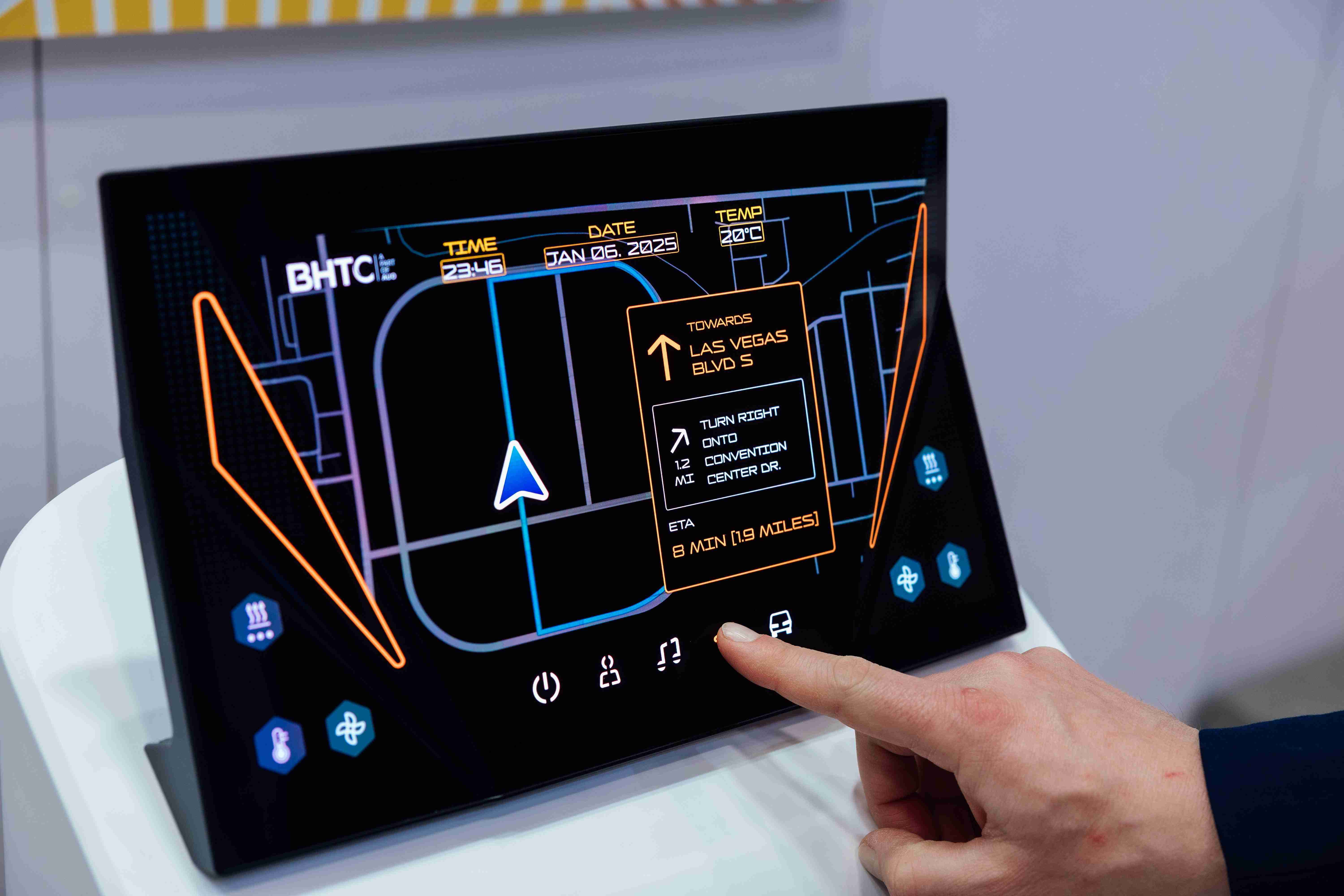 Micro LED可折迭触控显示器(Haptifold Display)结合BHTC多年HMI设计经验,,,,整合中控台和温度控制功能,,,,以优美的曲面和独特的外型助力车内设计美学,,,,在辅以触控回馈下,,,,为驾驶带来更直觉的使用体验。。