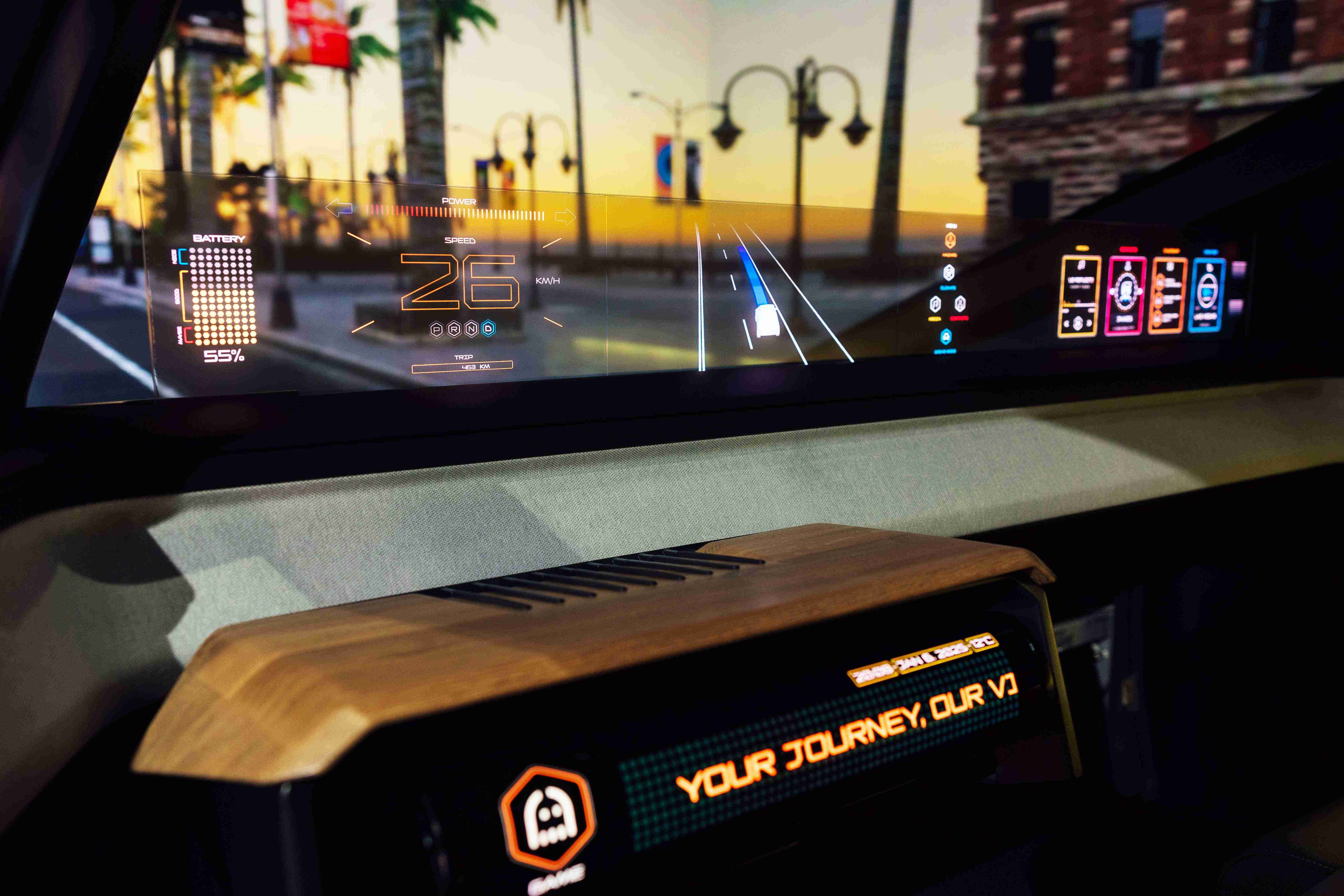 幻境全景天幕(Virtual Sky Canopy)将无缝拼接大型化的透明Micro LED显示器融入至天窗,,带来沉浸式体验,,,,将人机介面扩展至整个座舱。。。。 人生就是博光电以人性化的设计引领直觉式的人机互动,,,,透过多变形态中控显示(Morphing Center Control)、、隐藏式智驾介面(Foldable Cruise Pilot)等解决方案,,让乘用者依据自身需求调整、、、、控制座舱内所需功能。。。