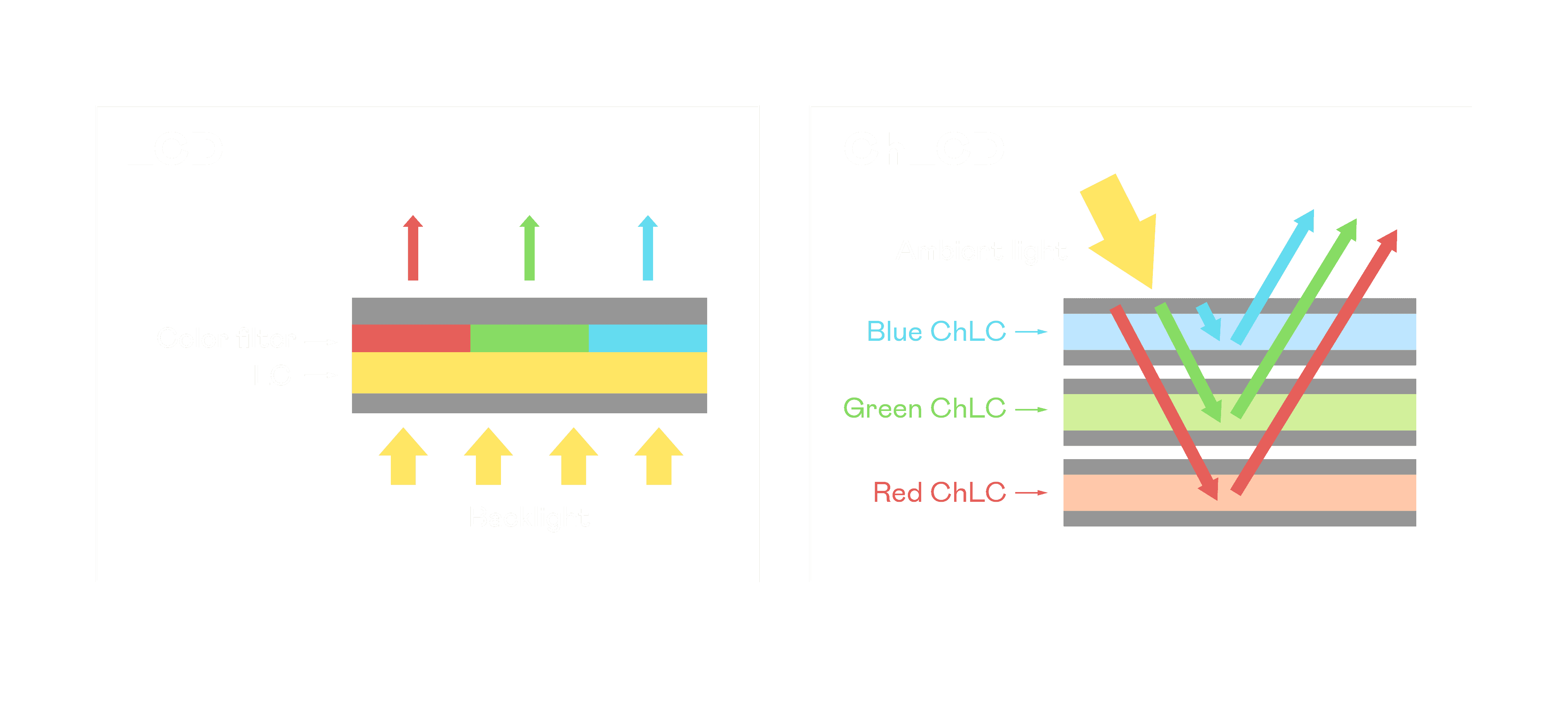 ChLCD 胆固醇液晶就如同纸张一样,,透过反射环境光来显示影像,,因此长时间观看不易造成人眼视觉疲劳,,可达到护眼效果。。当处于户外阳光下使用,,,,LCD 影像容易失真而不易观看,,,但胆固醇液晶仍可维持较佳的影像品质。。
